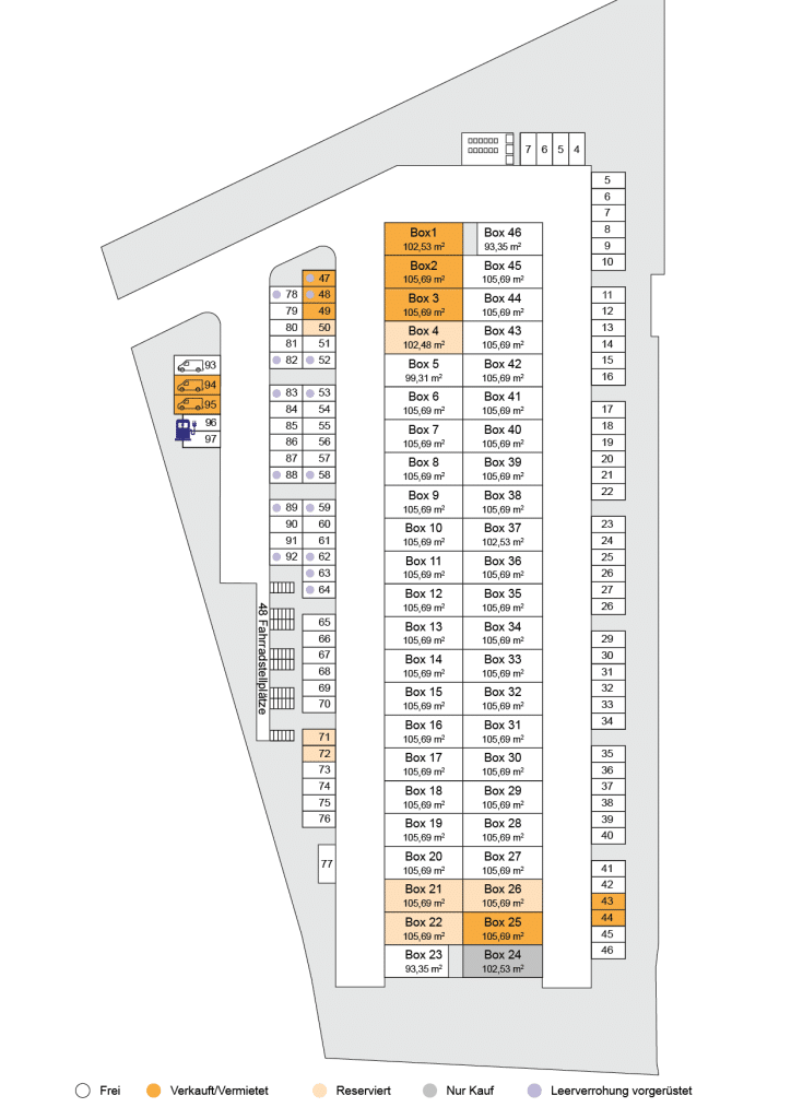 Darüber hinaus stehen Ihnen zwei verschiedene Immobilienarten zur Verfügung: Entscheiden Sie sich zwischen einer Standard Box von ca. 106 m² oder einer Eckbox. Letztere ist mit zusätzlichen Fenstern ausgestattet und damit ideal für die Nutzung als Bürofläche oder Showroom.