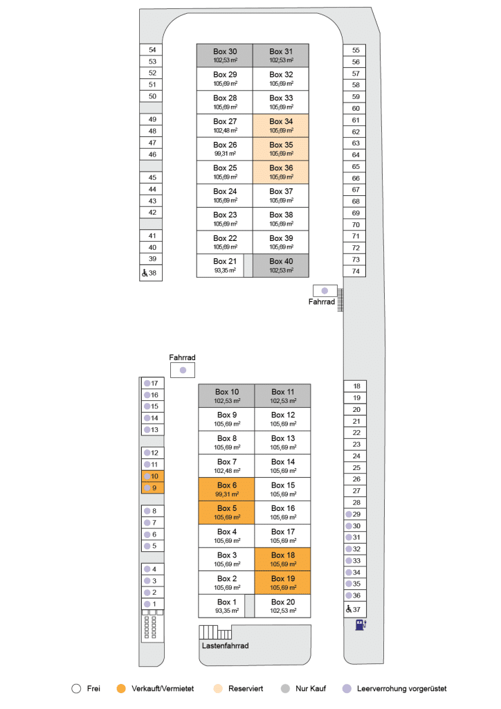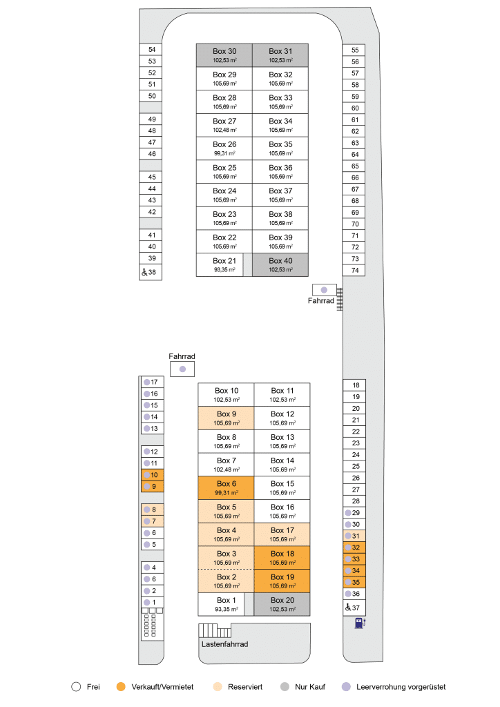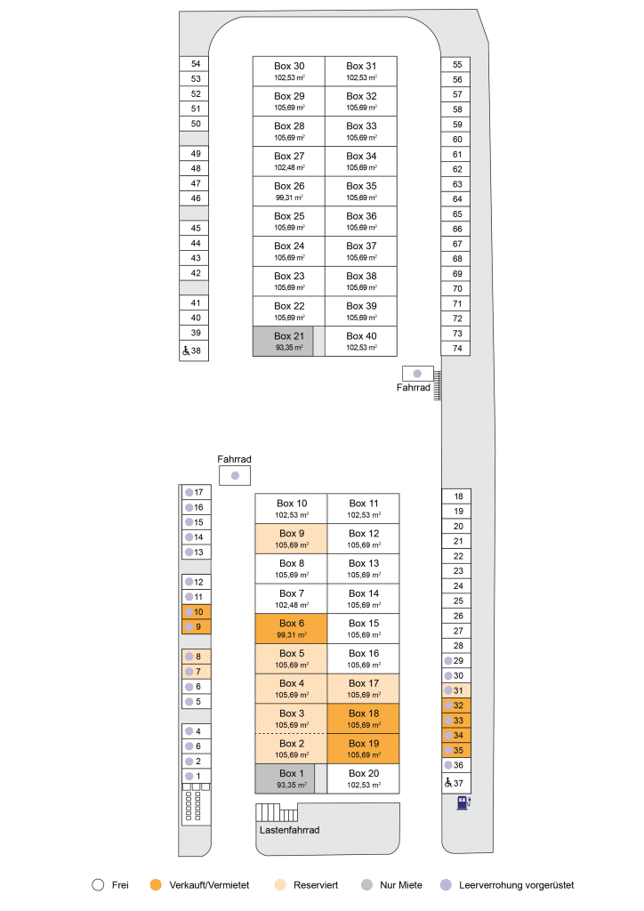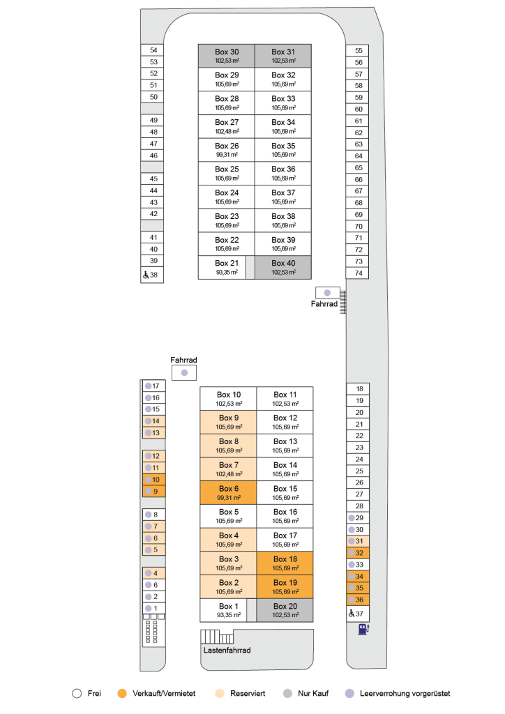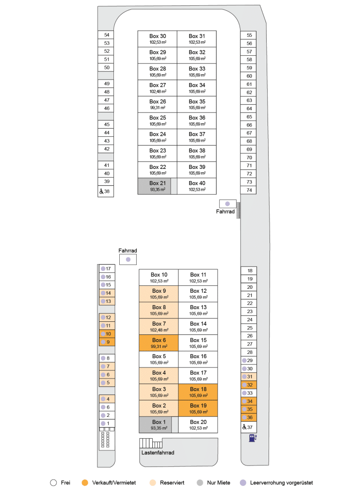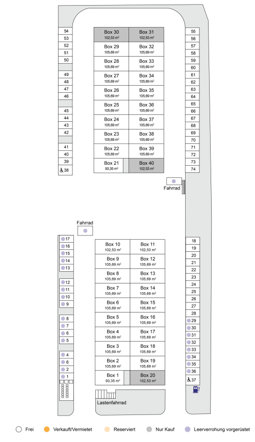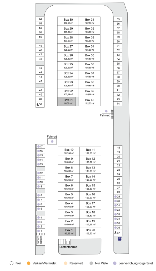 Jede Einheit bietet ca. 106 m², die nach Bedarf durch den Anschluss weiterer Räume erweitert werden können. Die sogenannte Streetbox können Sie in ihrer Ausstattung optimal an die Anforderungen Ihres Gewerbes beziehungsweise Ihrer Branche anpassen. Zudem profitieren Sie von einer ausgezeichneten Lage und einer guten Anbindung an das regionale Verkehrsnetz. Interessiert? Dann kaufen oder mieten Sie Ihre eigene Streetbox an unserem Standort in Essen!