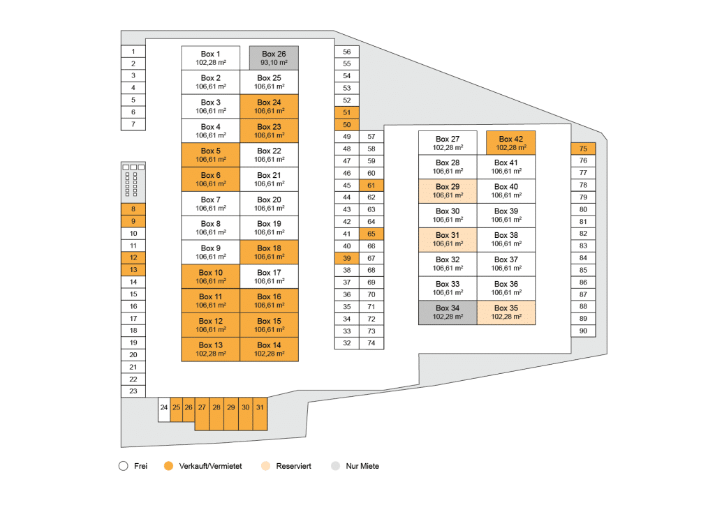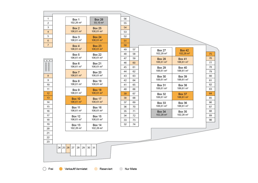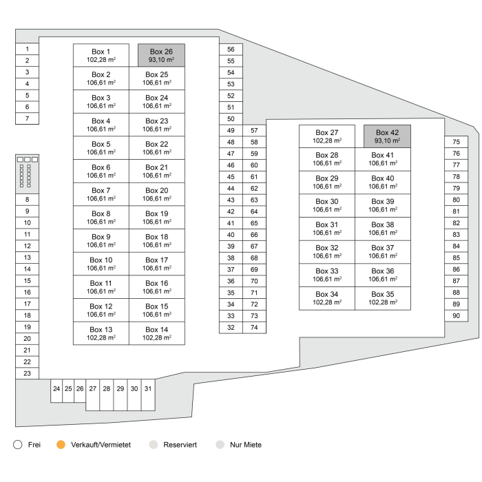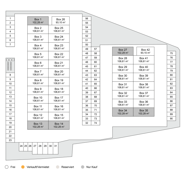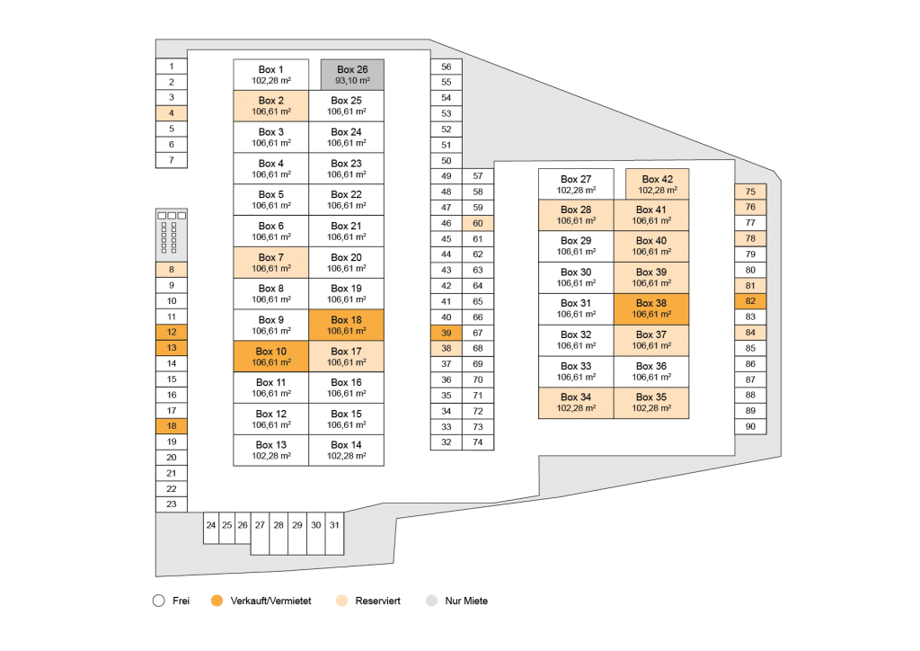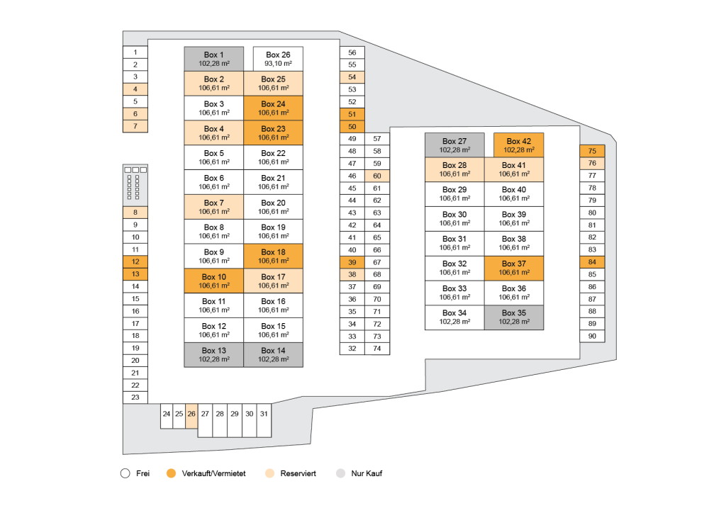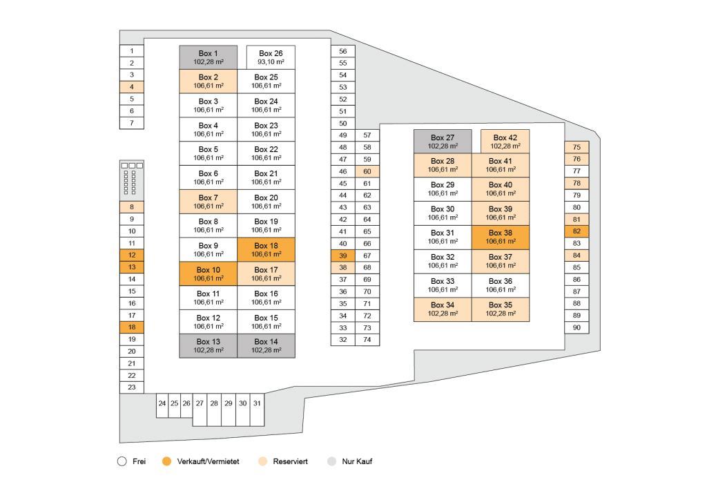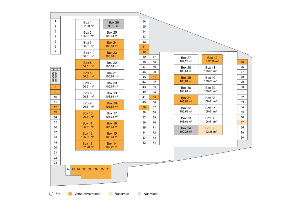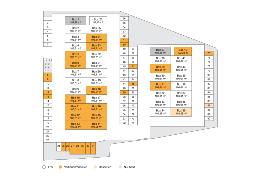 Jede Box ist rund 107 m² groß und bietet viel Raum für individuelle Ideen – unabhängig von der Art des Gewerbes. Denn der Rohbau lässt sich ganz nach Ihren Wünschen ausbauen und durch weitere Einheiten flexibel erweitern.
